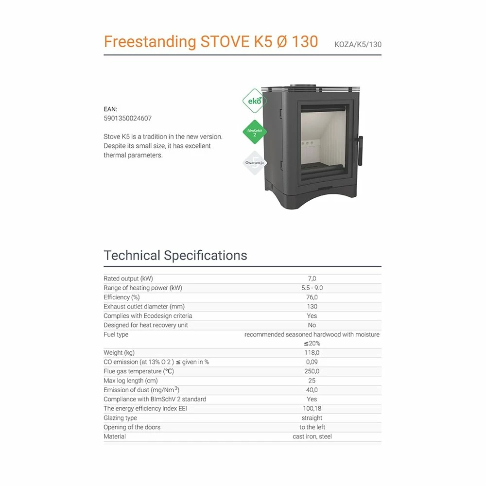 Ενεργειακή σόμπα KRATKI KOZA/K5/130 7KW / 50-70m2