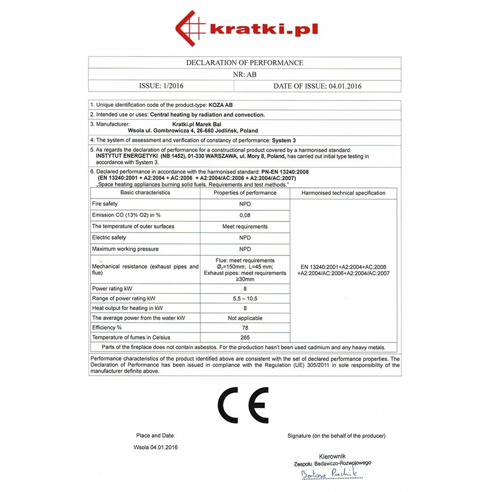 Ενεργειακή σόμπα ξύλου KRATKI KOZA/AB/S/DR 8KW / 50-70m2